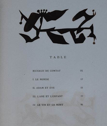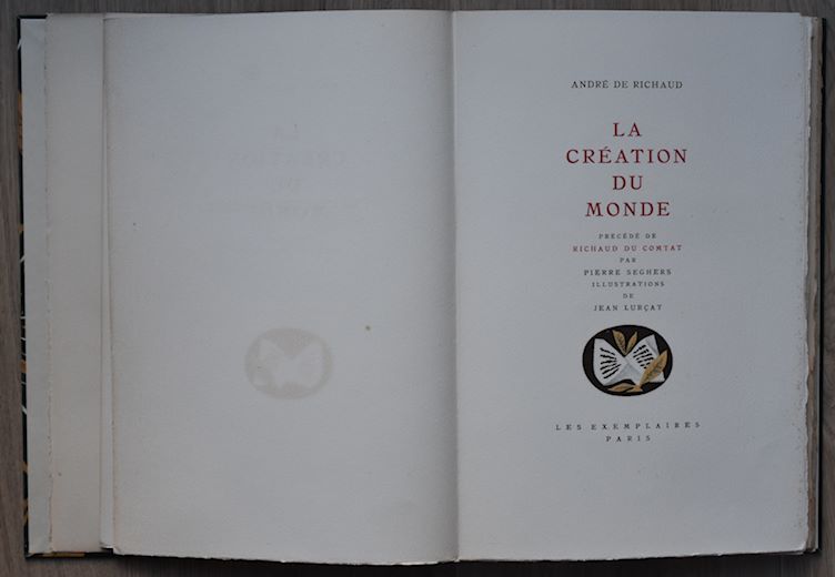 My interest was awakened last year , because i had the opportunity to buy possibly the most important book published with Lurcat lithographs. Published in an edition of only 99 copies, signed by the artist and numbered in print ( This is no. 20). The book LA CREATION DU MONDE, was published by Les Exemplaires with a story by Andre de Richaud and contains in total 56 original lithographs by Jean Lurcat. The book was printed by Mourlot/ Paris who was the leading printer for original lithographs in those days . Because of their qualities they were commissioned by the Galerie Maeght for their art publications too. The book is one of the highlights in my inventory and would grace many art book collection, but as always pictures tell a better story than words. Therefore i give you an impression of this magnificent publication which is now for sale together with the Sandberg designed catalogue at www.ftn-books.com